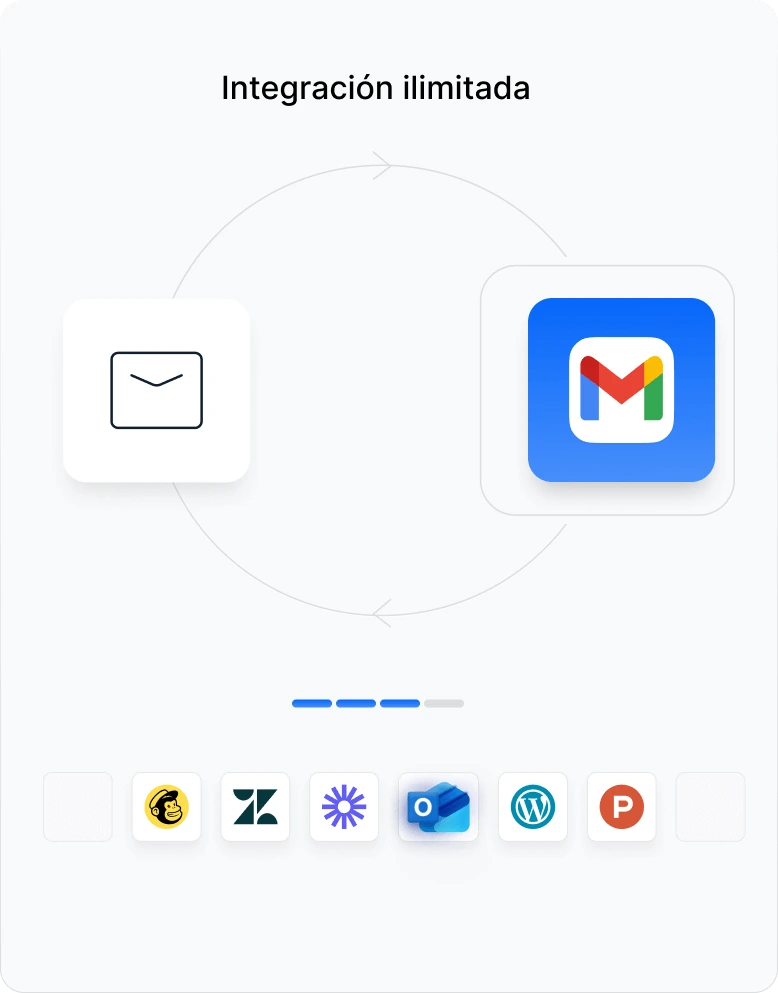 Conecta tu correo corporativo con Gmail, Outlook o cualquier cliente compatible vía SMTP/IMAP. Administra tus mensajes desde la plataforma que ya conoces y mantén la productividad de tu equipo sin complicaciones. Nuestra integración garantiza sincronización rápida y confiable, para que todos tus correos estén disponibles en un solo lugar.